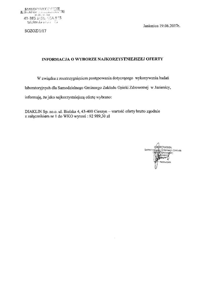 Informacja z rozstrzygnięcia ofert na wykonywanie świadczeń zdrowotnych w zakresie badań laboratoryjnych dla potrzeb Samodzielnego Gminnego Zakładu Opieki Zdrowotnej w Jasienicy: rozstrzygnięcie.pdf