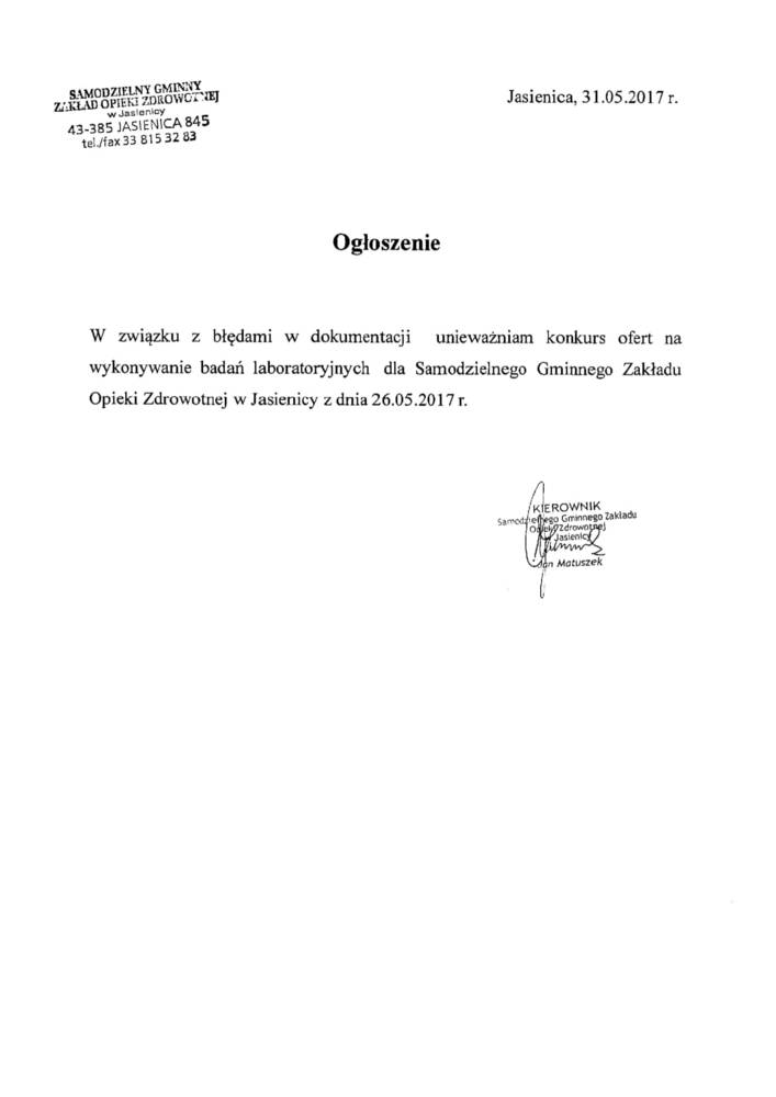 Unieważnienie konkursu ofert na wykonywanie badań laboratoryjnych ogłoszonego dnia 26.0.2017 r.